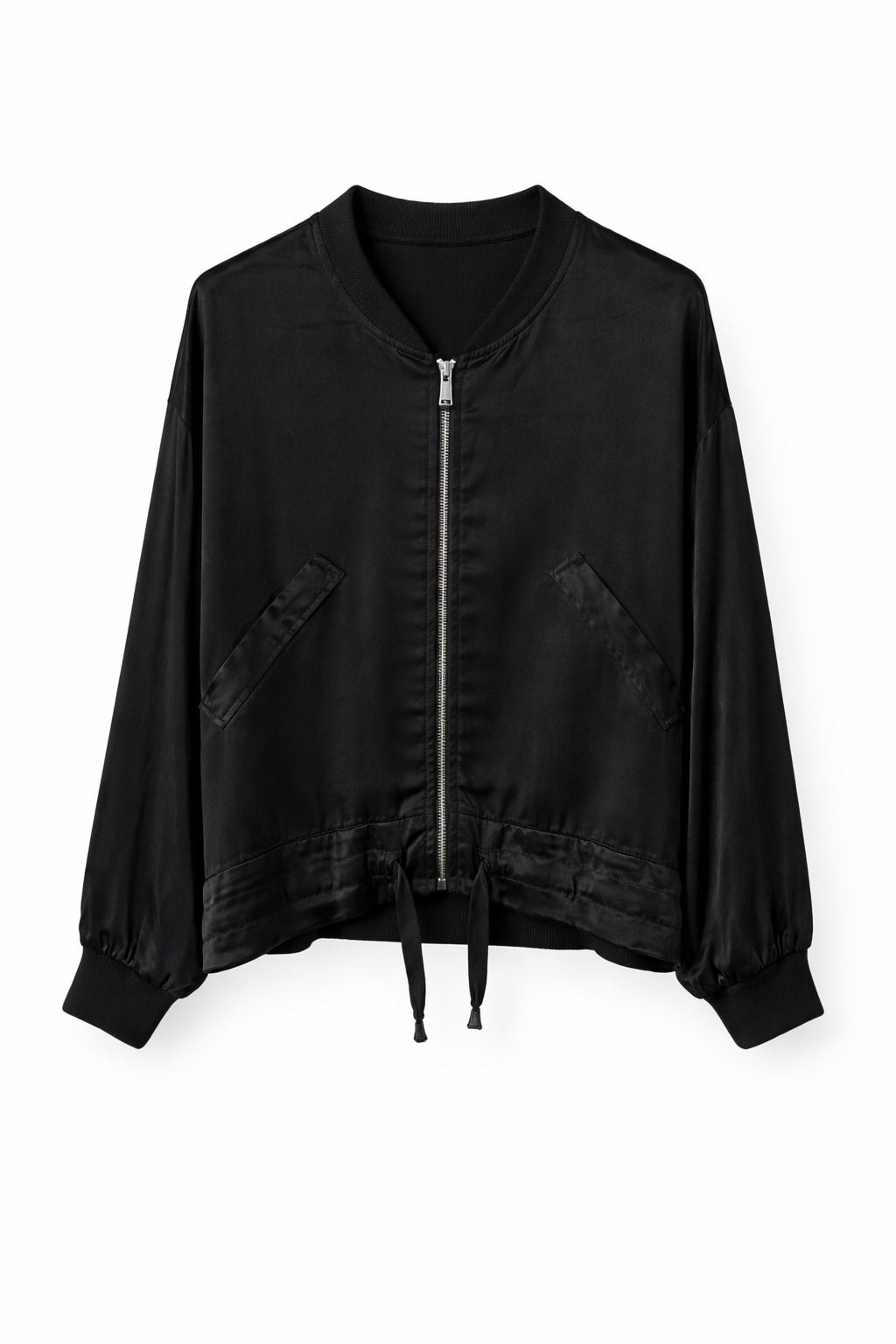 Effortlessly elegant and endlessly versatile, this satin bomber jacket is designed to elevate everyday looks. Crafted from a lightweight, fluid fabric with a subtle sheen, it offers a refined yet relaxed silhouette.