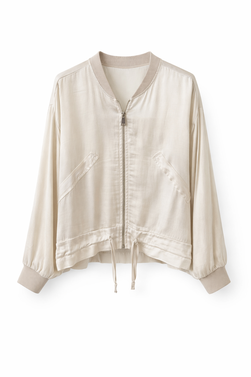 Featuring a front zip closure, softly structured collar, and elasticated cuffs, it blends comfort with a modern edge. The adjustable drawstring hem allows for a customizable fit, while discreet side pockets add both style and practicality.