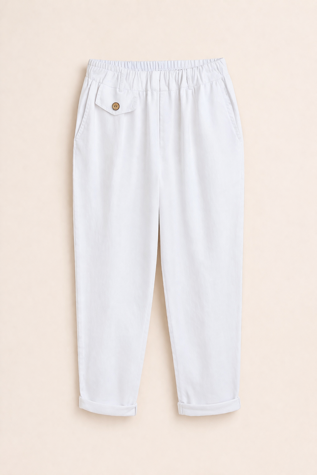Effortlessly refined and designed for everyday comfort, these trousers feature a relaxed silhouette with a softly tapered leg for a modern, flattering fit. The elasticated waistband ensures ease of wear, while subtle pleats add a touch of structure and elegance.