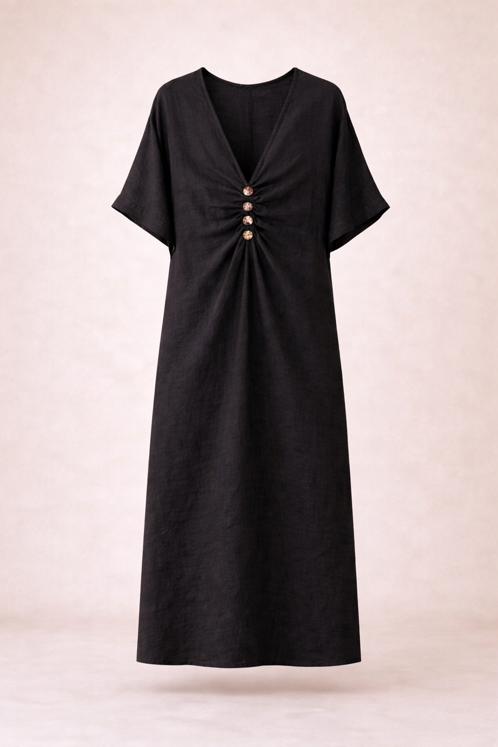 100% linen, lightweight, breathable, and with that effortless natural drape only premium fabrics can offer. The V-neckline elongates the silhouette, the buttons add character, and the relaxed cut brings comfort without compromising elegance.