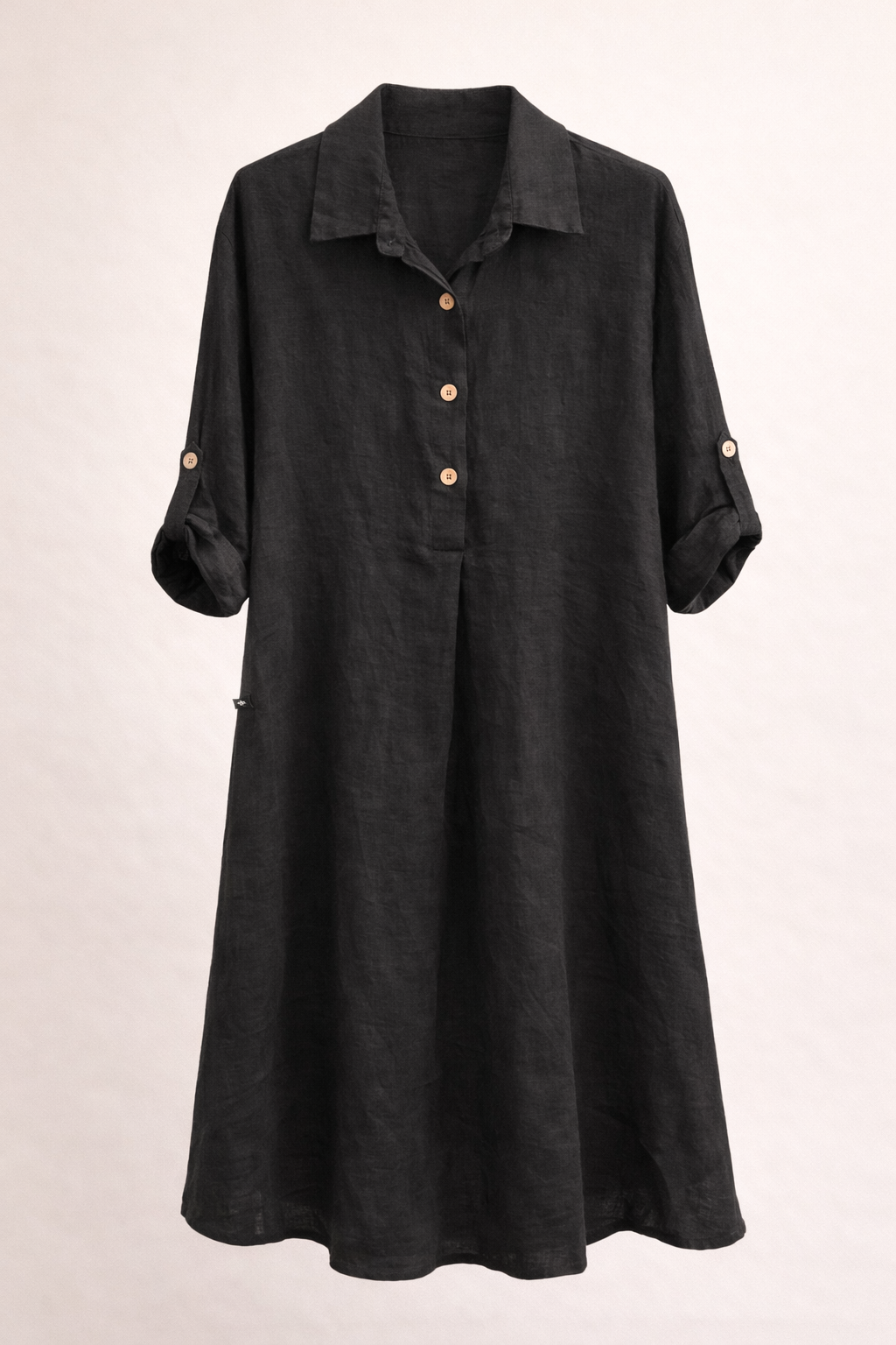 The dress is finished with a classic collar, natural wooden buttons and adjustable rolled sleeves, giving it a refined yet relaxed look. Its lightweight fabric allows the skin to breathe while maintaining a structured and elegant shape.