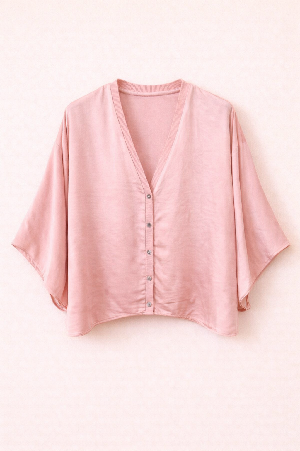Kimono-inspired blouse with a fluid, elegant silhouette designed for effortless sophistication. The V-neckline elongates the figure, while the delicate front button closure adds a refined and feminine touch.