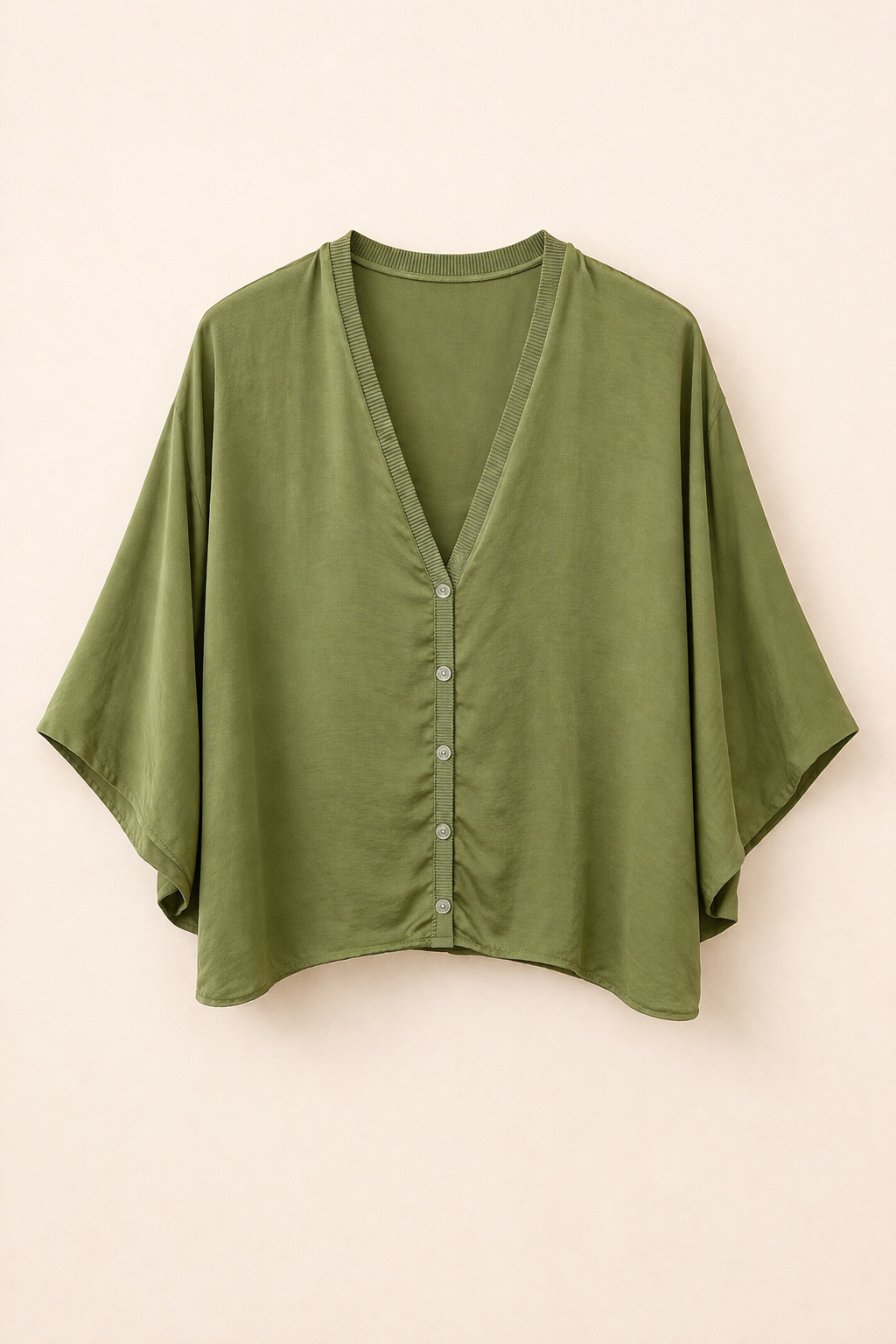Kimono-inspired blouse with a fluid, elegant silhouette designed for effortless sophistication. The V-neckline elongates the figure, while the delicate front button closure adds a refined and feminine touch.