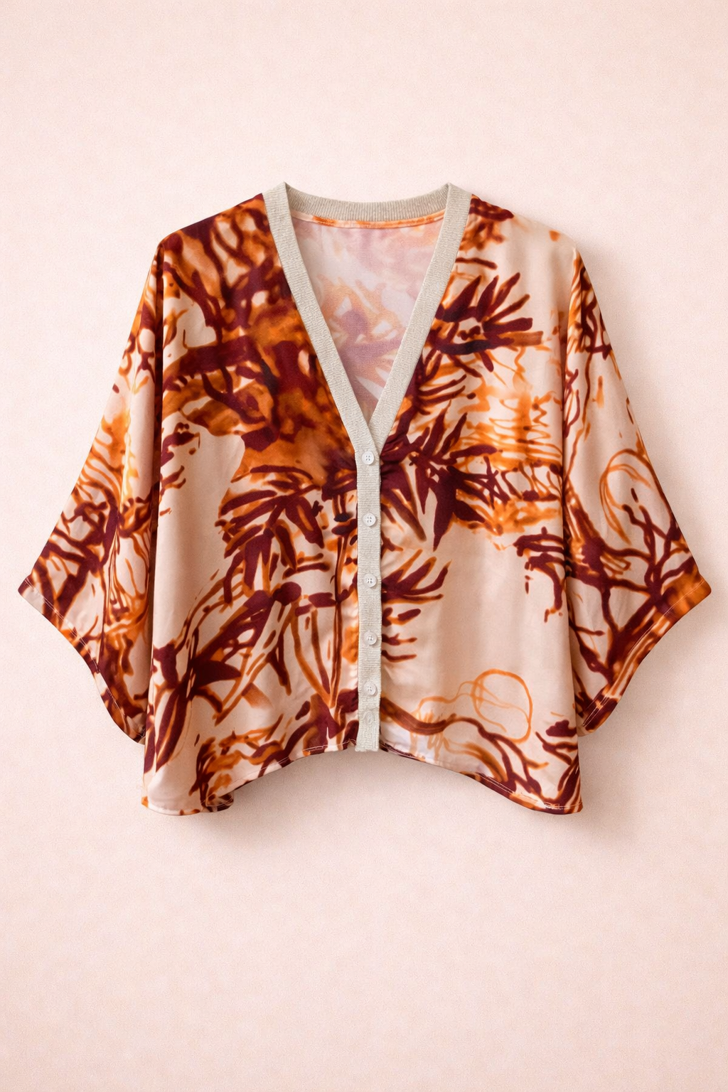 The wide, flowing sleeves enhance movement and comfort, while the artistic abstract print gives the piece a modern yet timeless feel. Crafted from a smooth, breathable fabric, it’s perfect for both everyday wear and more elevated occasions.