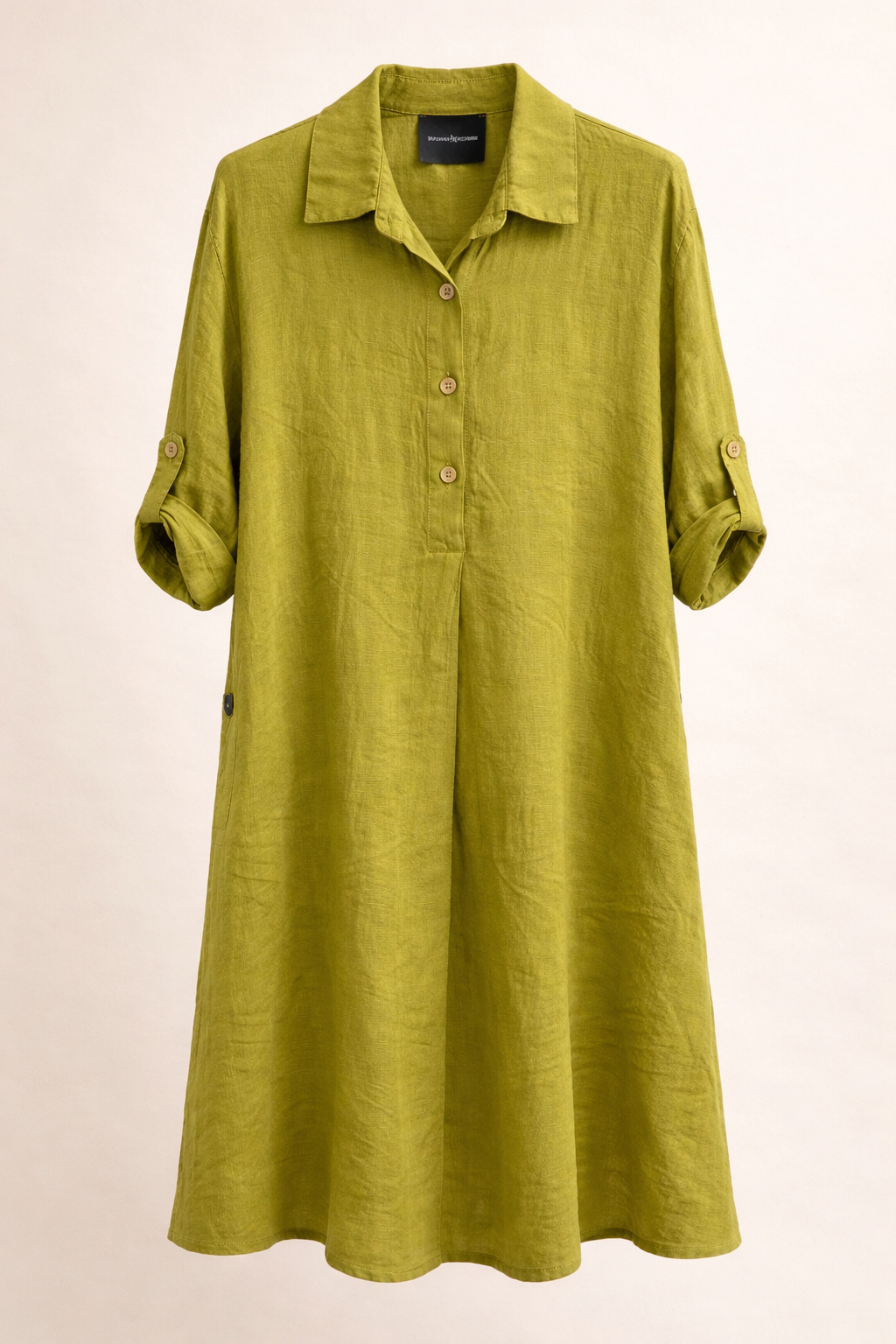 The dress is finished with a classic collar, natural wooden buttons and adjustable rolled sleeves, giving it a refined yet relaxed look. Its lightweight fabric allows the skin to breathe while maintaining a structured and elegant shape.