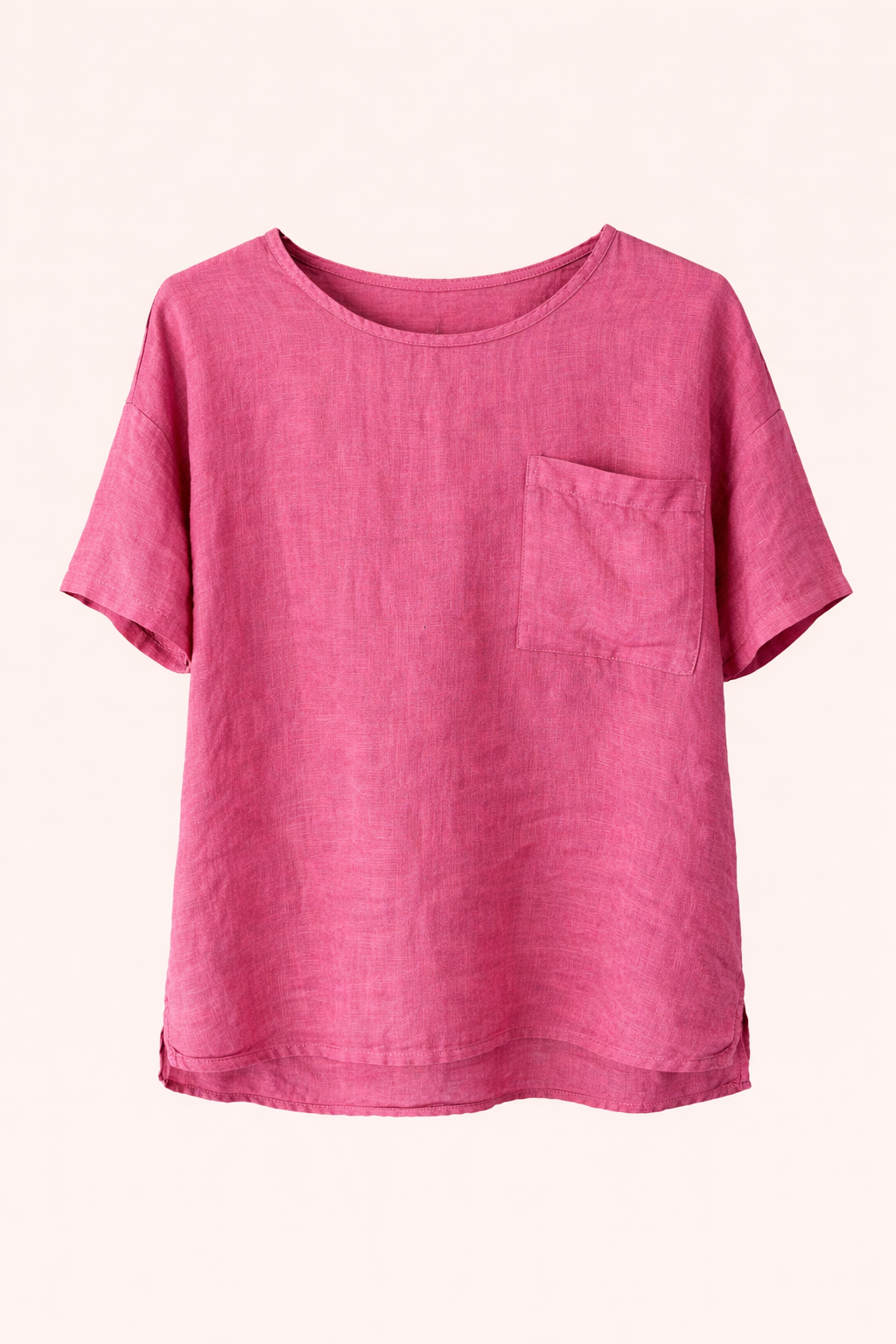 The slightly curved hem and loose sleeves create a flattering, easy fit that drapes beautifully on the body. Perfect to pair with linen trousers, skirts, or denim for an effortlessly chic summer look.