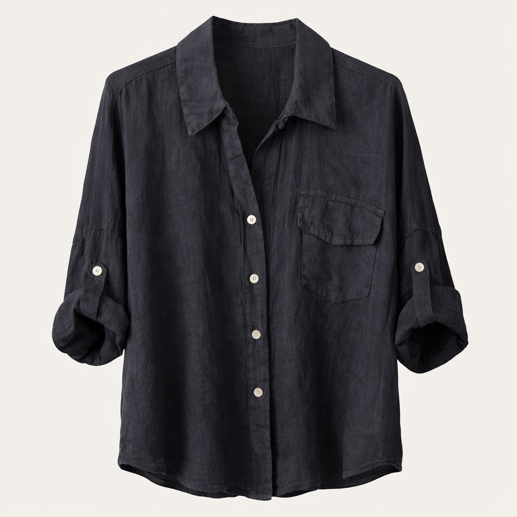 Designed with a soft, loose silhouette, it drapes beautifully on the body while allowing maximum comfort and airflow. The classic collar neckline, delicate button-down front, and single chest pocket add a touch of understated sophistication. The roll-up sleeves with button tab allow versatile styling, making it easy to wear from day to evening.