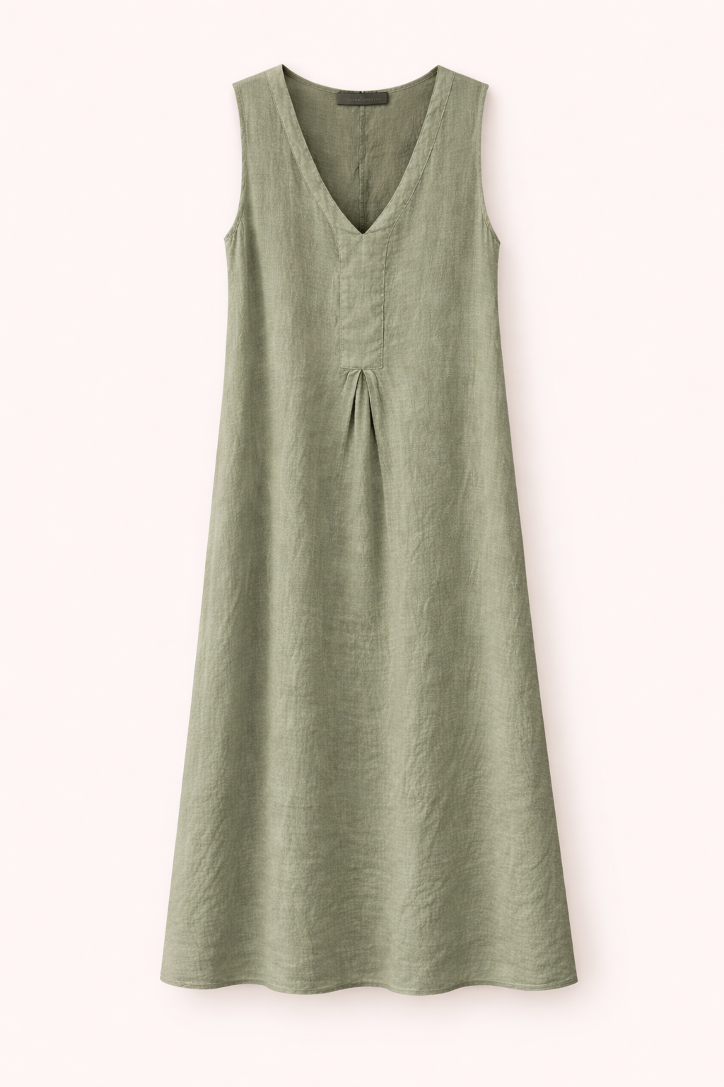 A timeless midi dress crafted from 100% linen, designed for effortless elegance and natural comfort. Featuring a softly flared silhouette, it offers a relaxed fit that moves beautifully without clinging to the body.