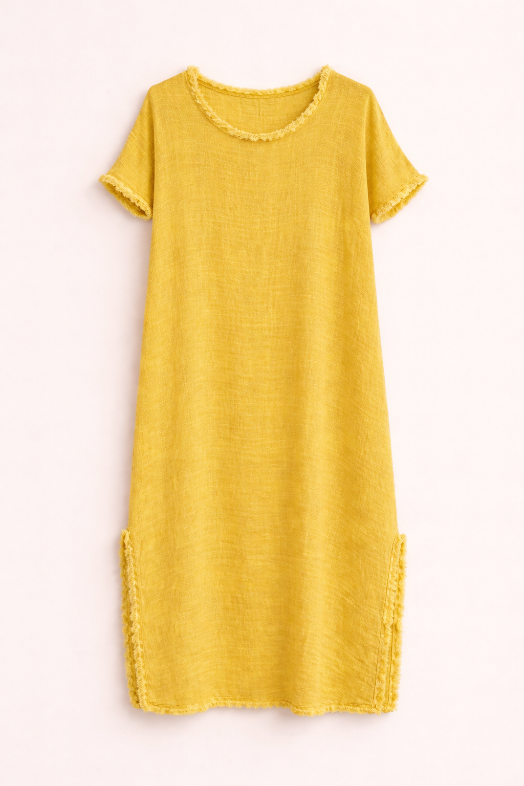 Dress made from 100% linen with a light, breathable feel—perfect for warm days. Designed with a relaxed, loose silhouette that offers effortless comfort and a natural drape. Frayed finishes along the neckline, sleeves, and hem add an artisanal, authentic touch, while side slits enhance movement and fluidity. The vintage-dyed effect creates a unique, subtly irregular look that highlights the texture of the fabric and reinforces a refined boho aesthetic. Ideal for easy, elegant, and timeless styling.