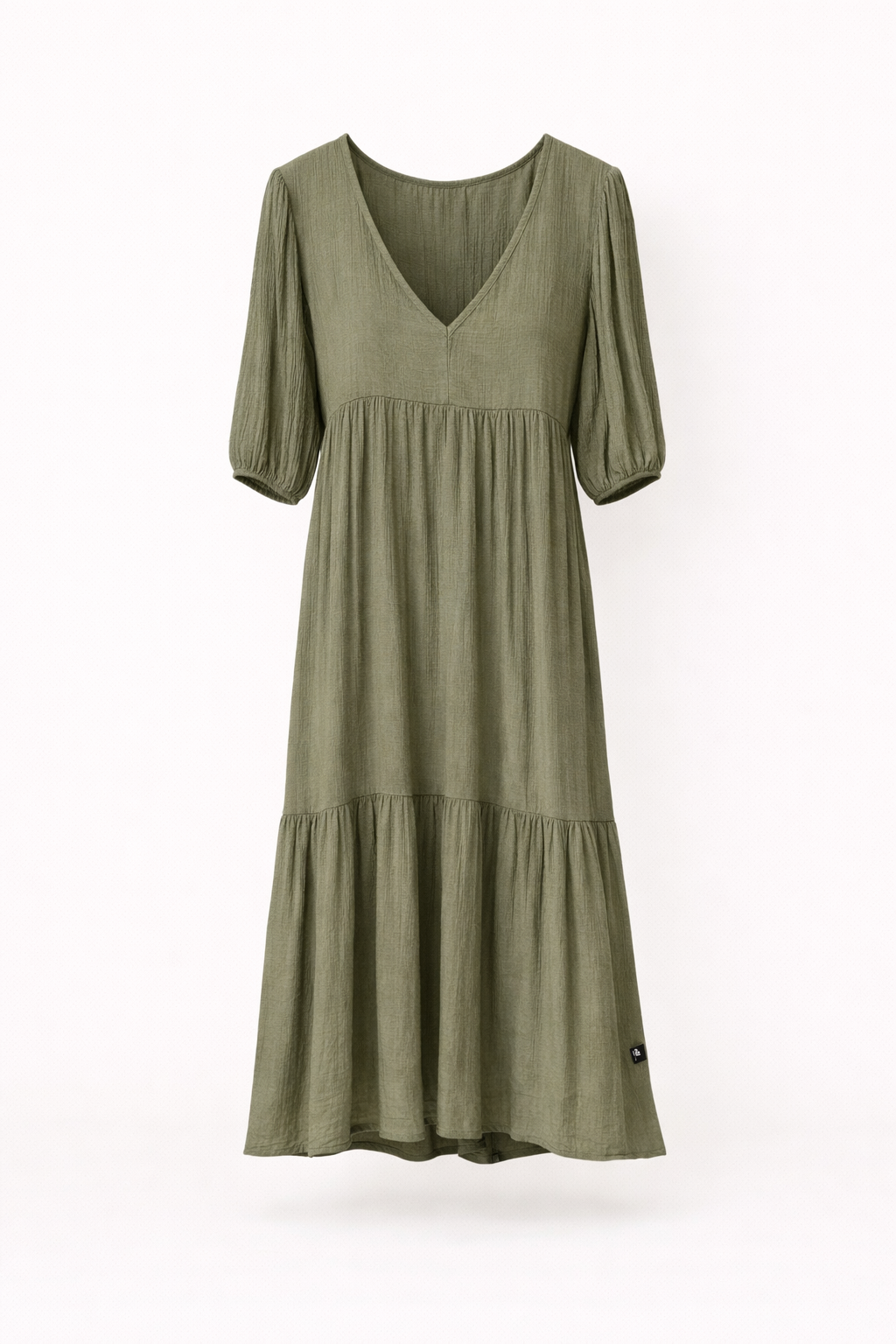 It features a flattering V-neckline and relaxed elbow-length sleeves with gentle elastic cuffs. The empire waist enhances the silhouette, flowing into a tiered skirt that adds movement and softness to the overall design.
