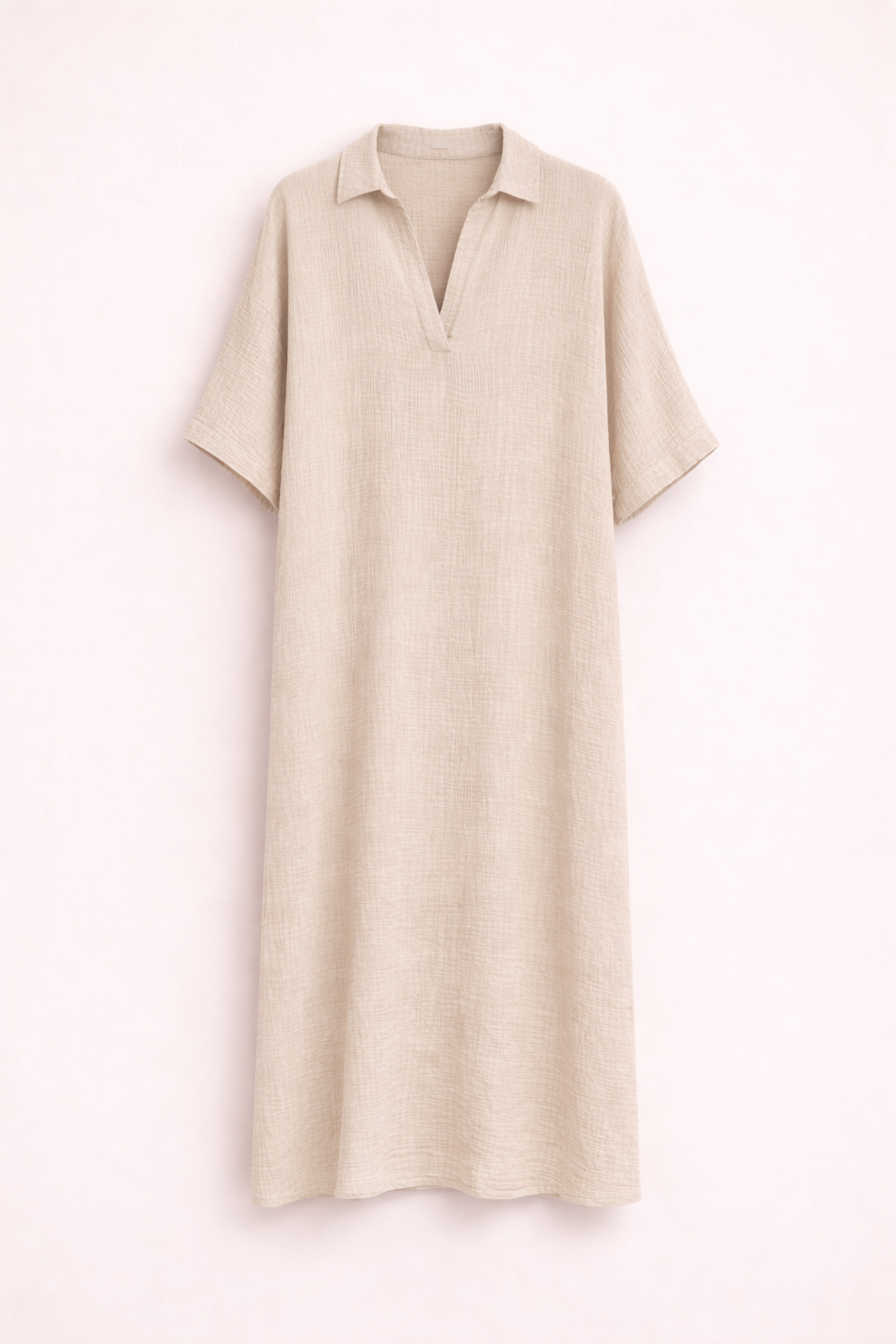 This elegant midi dress is crafted from lightweight, textured fabric that offers both comfort and effortless style. Featuring a relaxed silhouette, short sleeves, and a flattering V-neckline with a subtle collar, it is perfect for everyday wear or special occasions.