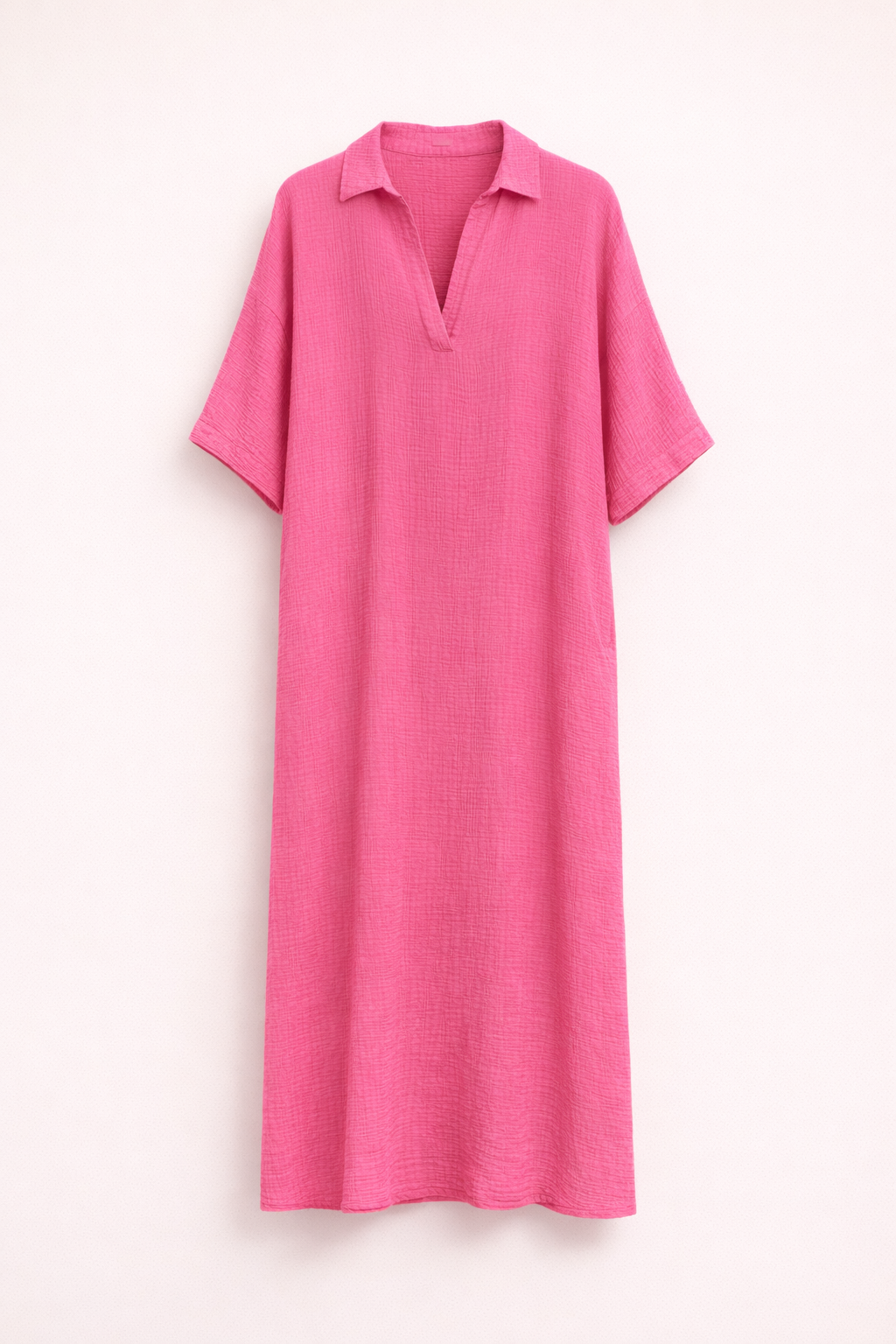 This elegant midi dress is crafted from lightweight, textured fabric that offers both comfort and effortless style. Featuring a relaxed silhouette, short sleeves, and a flattering V-neckline with a subtle collar, it is perfect for everyday wear or special occasions.